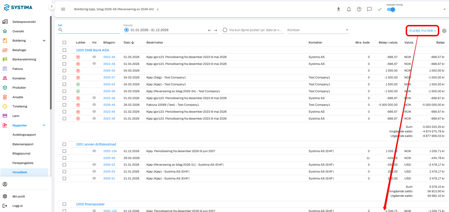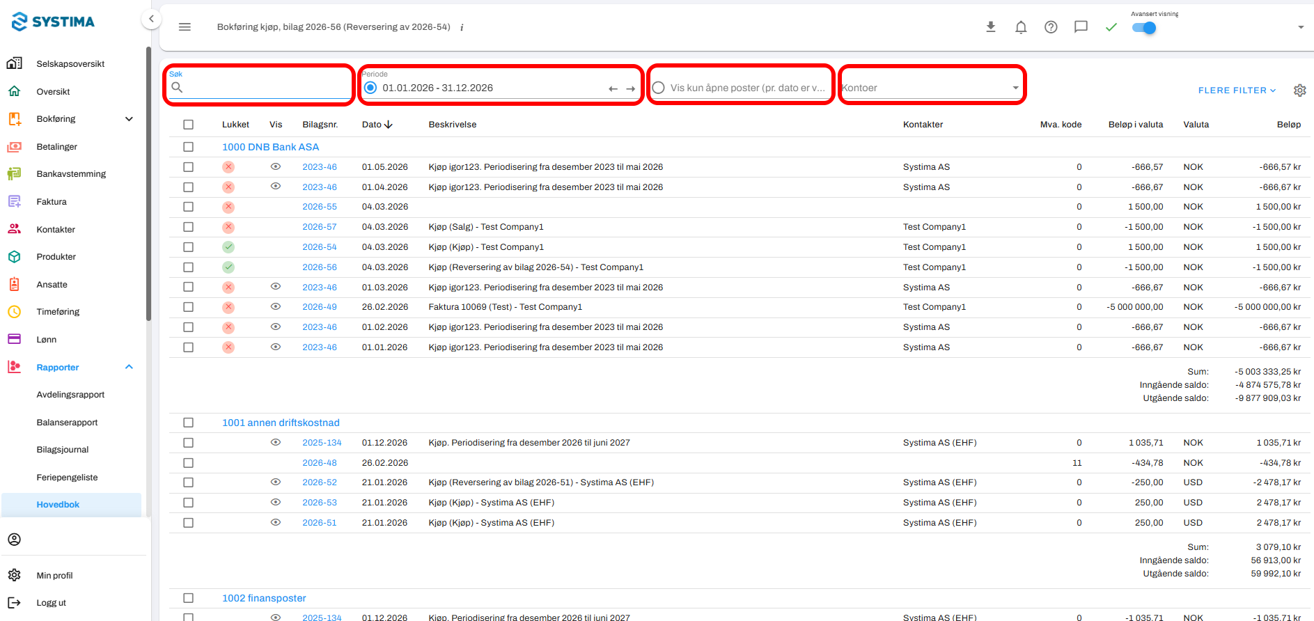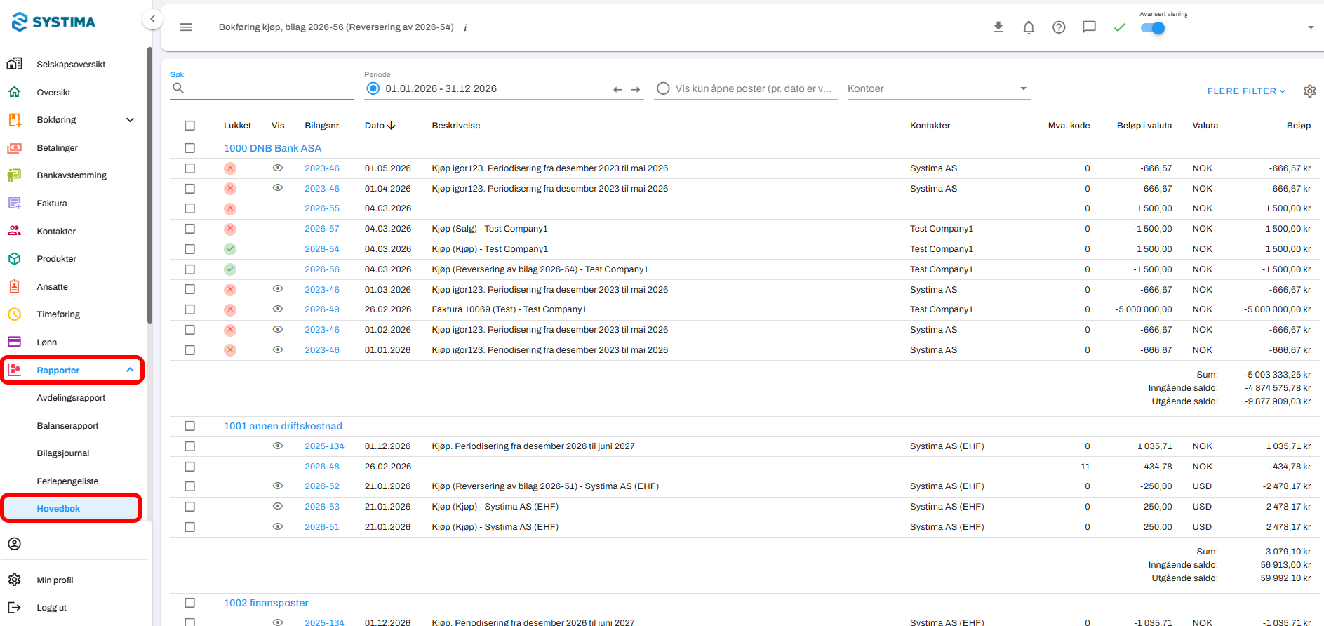 Gå til Rapporter → Hovedbok.