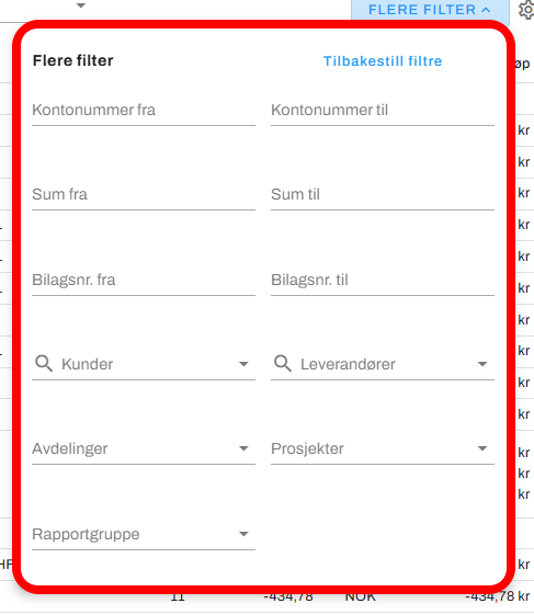 Dersom du trenger flere filtreringsmuligheter, kan du klikke på Flere filter. Da får du tilgang til flere valg: