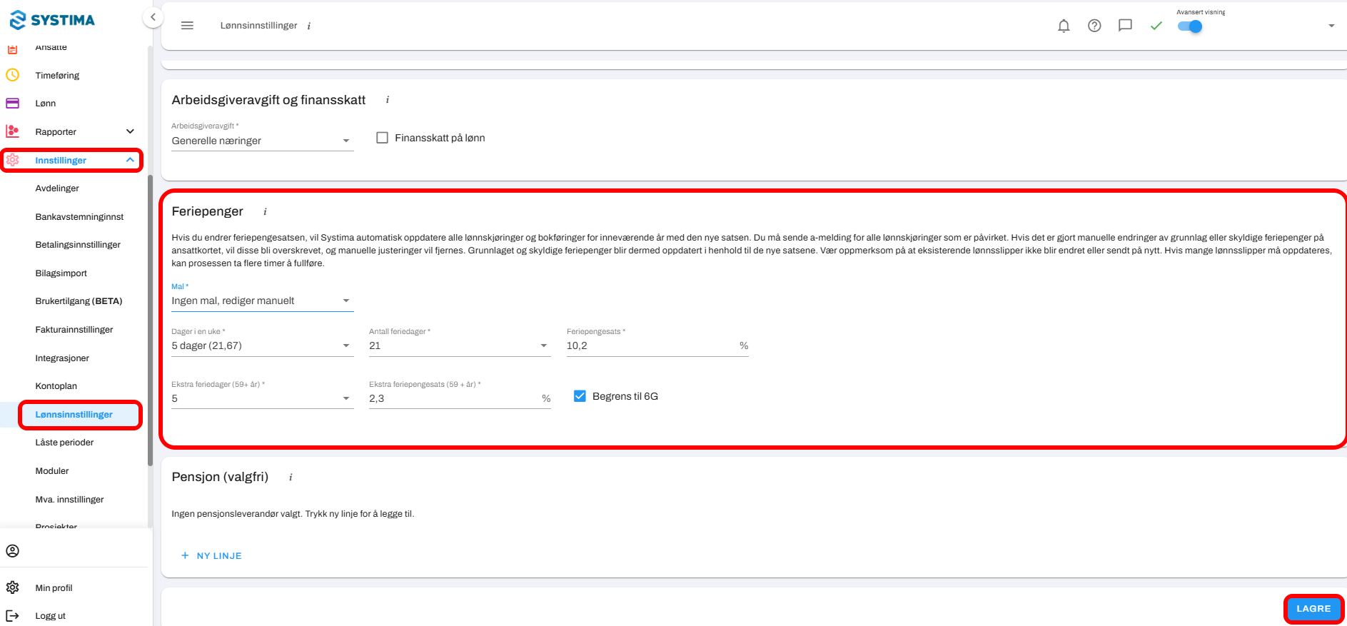 Denne veiledningen forklarer hvordan du endrer feriepengesatsen for inneværende år i Systima. Endringen påvirker beregninger for lønn og bokføring, og det er derfor viktig å være oppmerksom på hvilke konsekvenser justeringen kan ha før du lagrer.